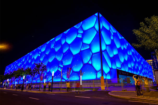 國(guó)家游泳中心又被稱(chēng)為“水立方”(Water Cube)位于北京奧林匹克公園內(nèi),它的設(shè)計(jì)方案,是經(jīng)全球設(shè)計(jì)競(jìng)賽產(chǎn)生的“水的立方”(Water Cube )方案。其與國(guó)家體育場(chǎng)(俗稱(chēng)鳥(niǎo)巢)分列于北京城市中軸線(xiàn)北端的兩側(cè),共同形成相對(duì)完整的北京歷史文化名城形象。國(guó)家游泳中心規(guī)劃建設(shè)用地62950平方米,總建筑面積65000-80000平方米,其中地下部分的建筑面積不少于15000平方米,長(zhǎng)寬高分別為 177m × 177m × 30m。來(lái)自101個(gè)國(guó)家和地區(qū)的35萬(wàn)多港澳臺(tái)同胞及海外僑胞共捐獻(xiàn)了9.4億人民幣。其中鄭裕彤、鄭家純父子及屬下企業(yè)曾捐贈(zèng)五千萬(wàn)元人民幣。